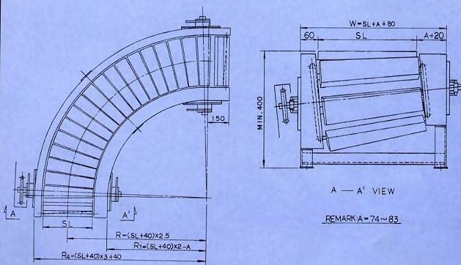 - Feature:It is designed to overcome the Problem of curve conveying of heavy unit and large material by using special flexible chain.